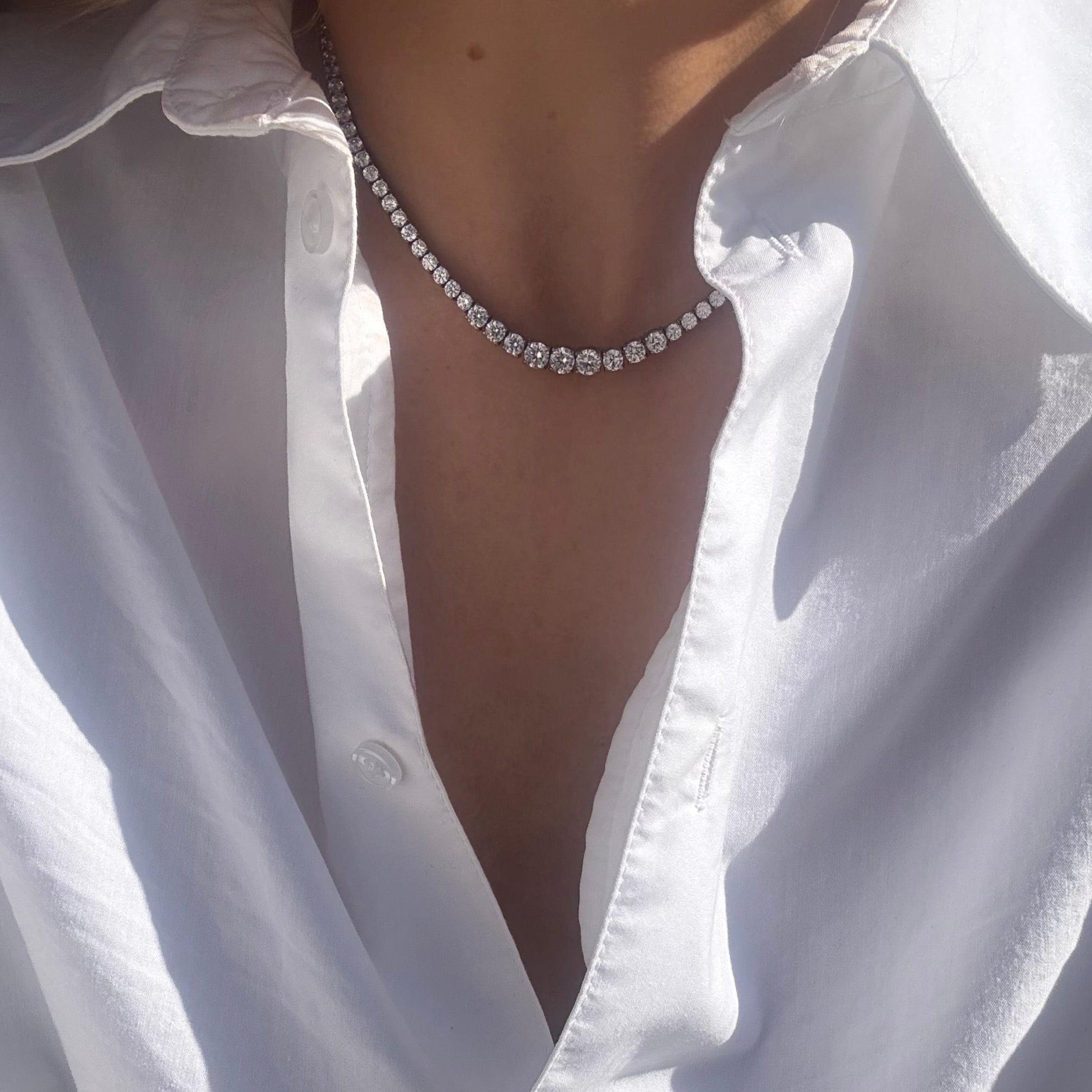Vores Leonora Tennishalskæde er et tidløst smykke, der tilføjer elegance til både hverdags- og aftenlook. Med de større sten i bunden skabes et smukt og iøjnefaldende design, der tilfører et eksklusivt touch til ethvert outfit. Denne halskæde er perfekt til både hverdagsbrug og særlige lejligheder, hvor du ønsker at stråle.