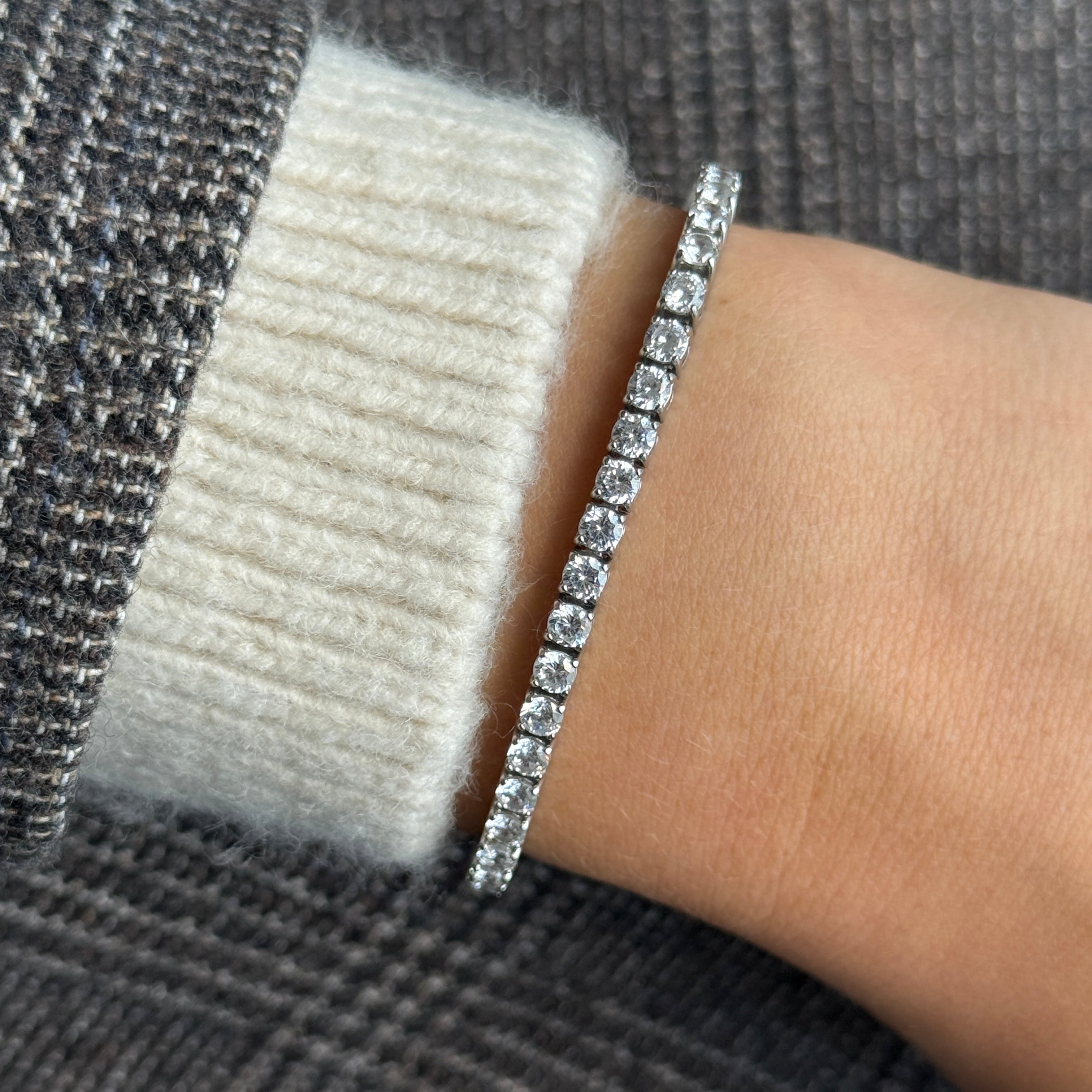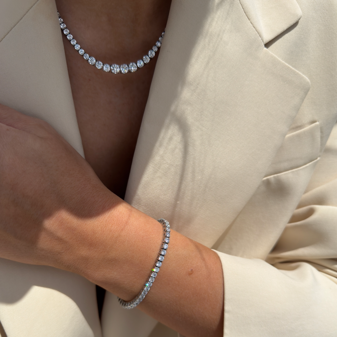 Leonora Tennishalskæden og vores klassiske tennisarmbånd er to tidløse favoritter, der sammen skaber et sofistikeret og iøjnefaldende look.